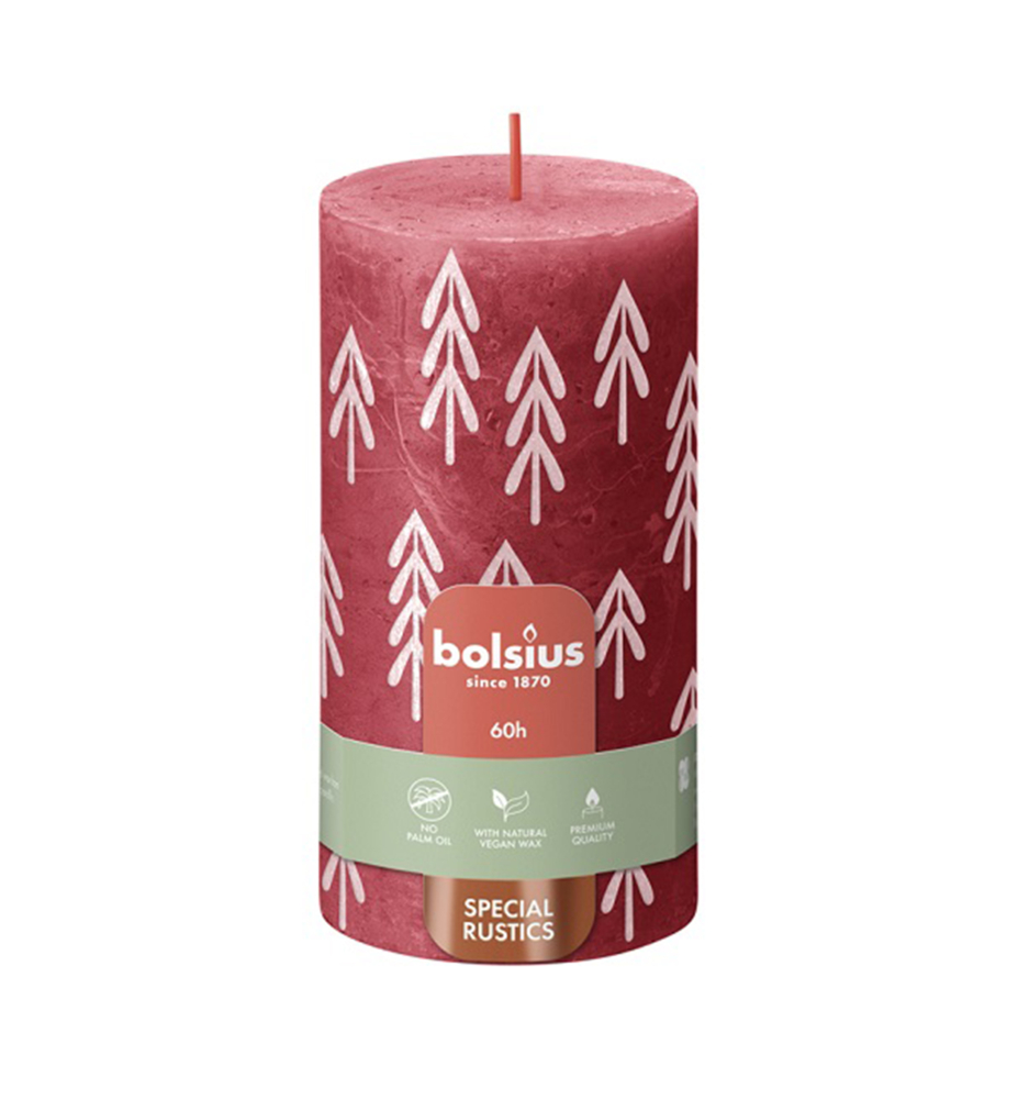 Charakteristika: Kolekcia Rustic sviečok z kvalitného parafínu a rastlinných olejov. Novinkou je lesklá úprava rustic prevedenia sviečky. Povrch je hladký, lesklý v odtieni červenej a s potlačou stromčekov. Veľkosť sviečky je vhodná aj do svietnikov. Nové trblietavé odtiene dodávajú vášmu bývaniu sviatočný glamour nádych. Rozmer: 130x68 mm.