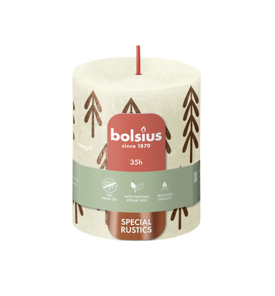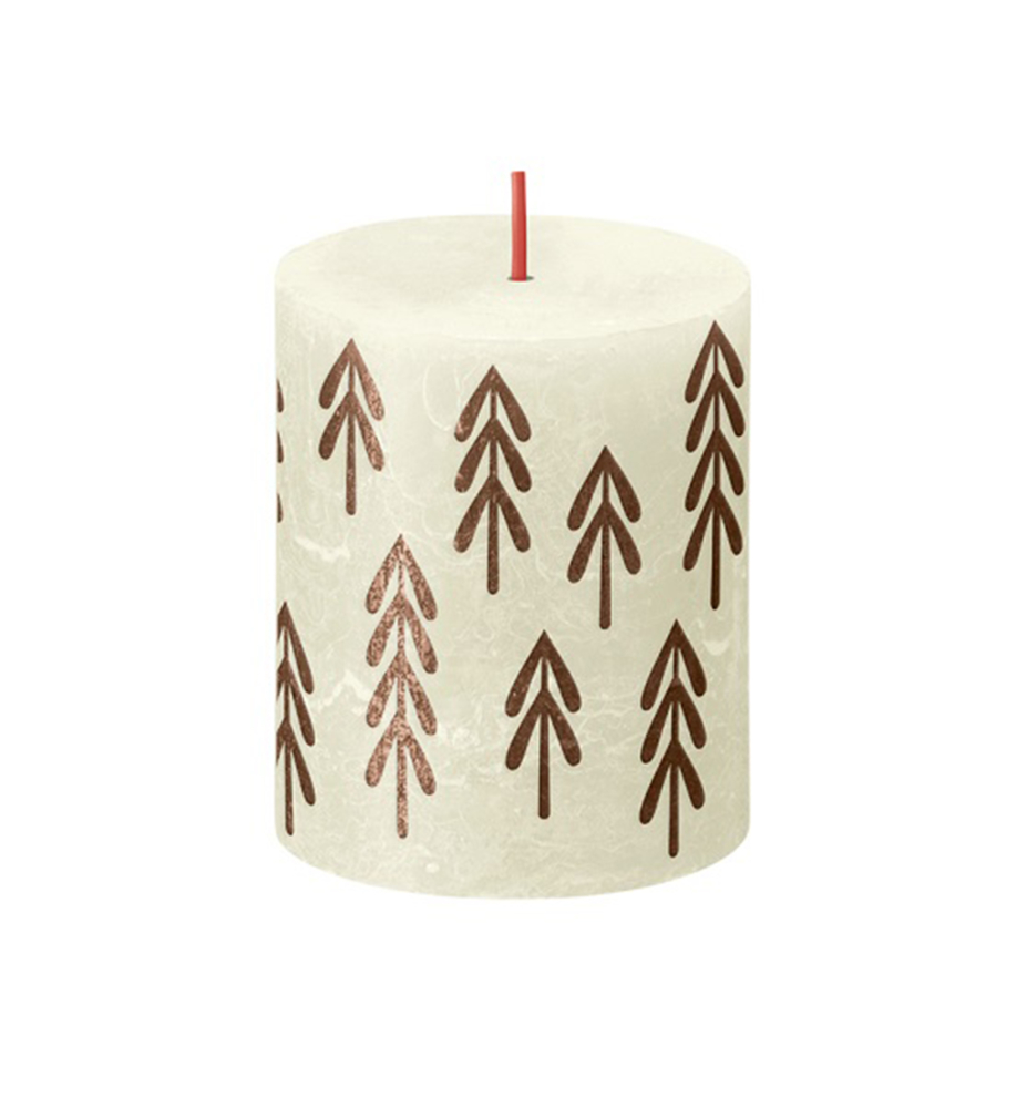 Charakteristika: Kolekcia Rustic sviečok z kvalitného parafínu a rastlinných olejov. Novinkou je lesklá úprava rustic prevedenia sviečky. Povrch je hladký, lesklý v odtieni bielej a s potlačou stromčekov. Veľkosť sviečky je vhodná aj do svietnikov. Nové trblietavé odtiene dodávajú vášmu bývaniu sviatočný glamour nádych. Rozmer: 80x68 mm.