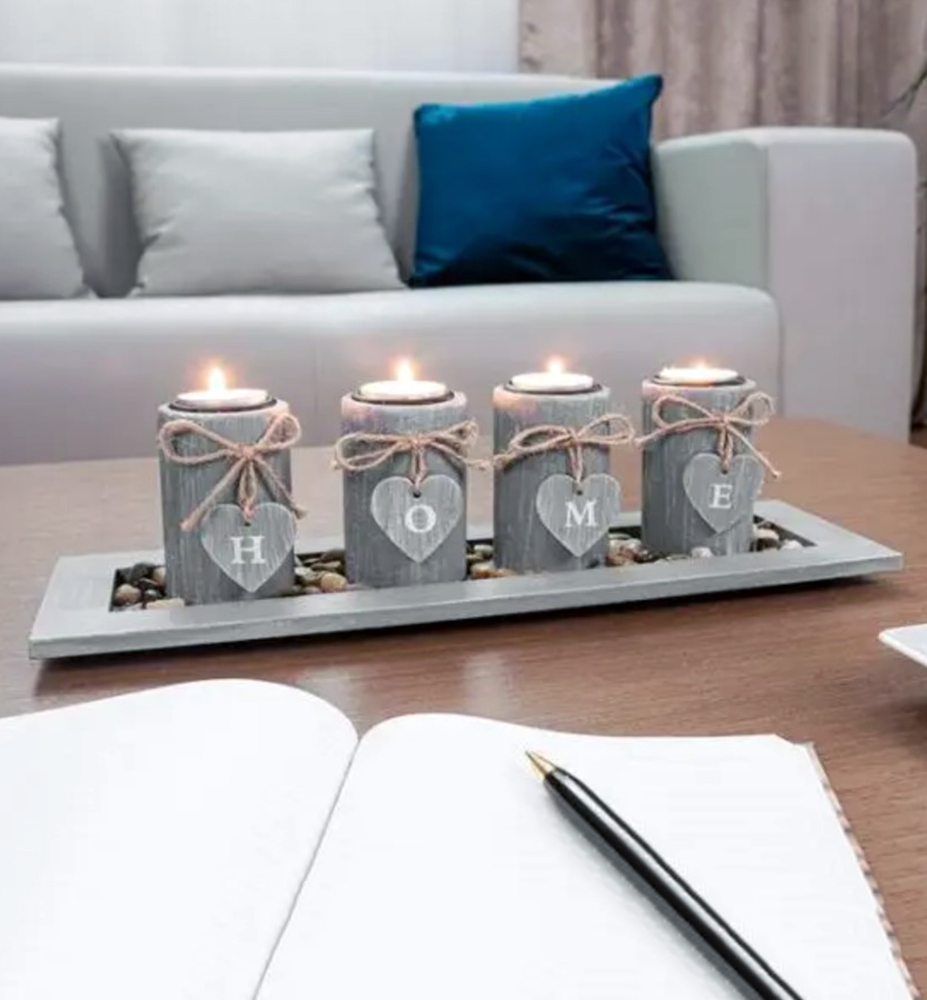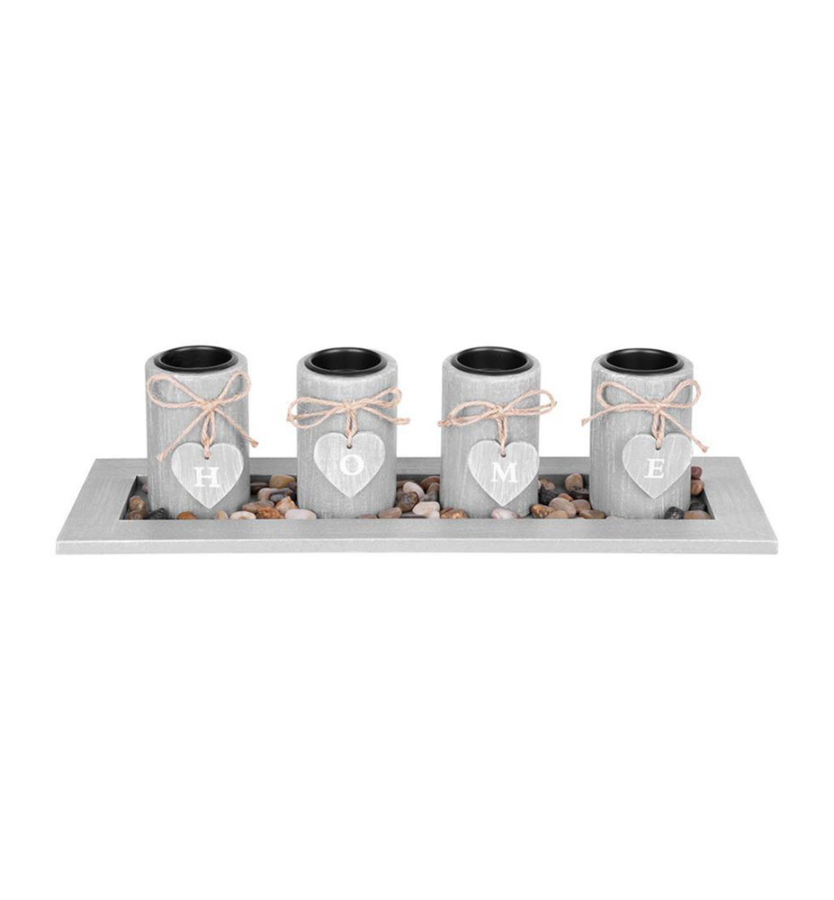 Charakteristika: Svietnik MagicHome je krásnym doplnkom do vášho domova. Farba je sivá. Slúži ako podnos na čajové sviečky. Drevený vintage štýl s prírodnými kameňmi, jutou a nápisom "HOME" vytvorí u vás doma dokonalú atmosféru. Čajové sviečky sú súčasťou balenia. Rozmer je 39x12,5x10 cm.