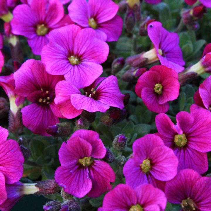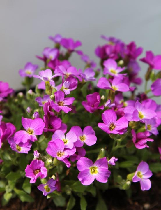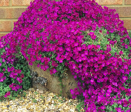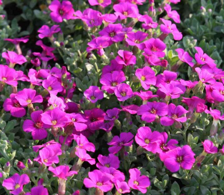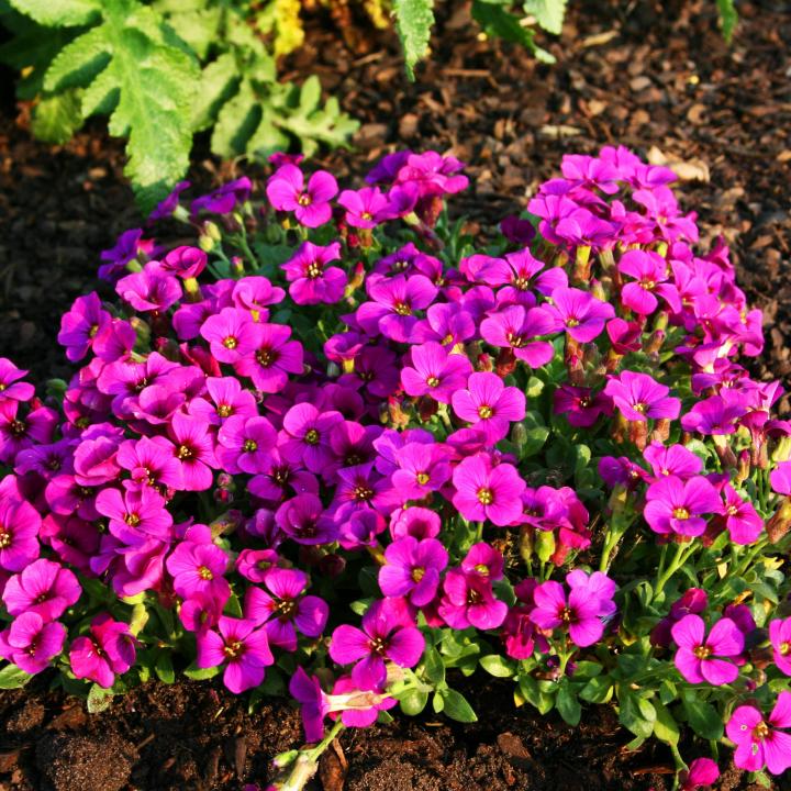 Pôdopokryvná bohato kvitnúca rastlina s atraktívnymi purpurovými kvetmi.