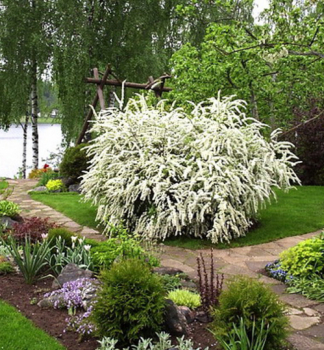 Opadavý ker s prevísajúcimi výhonmi so zlatožltými listami a bielymi kvetmi.