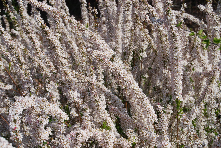 Opadavý ker s prevísajúcimi výhonmi so zlatožltými listami a bielymi kvetmi.