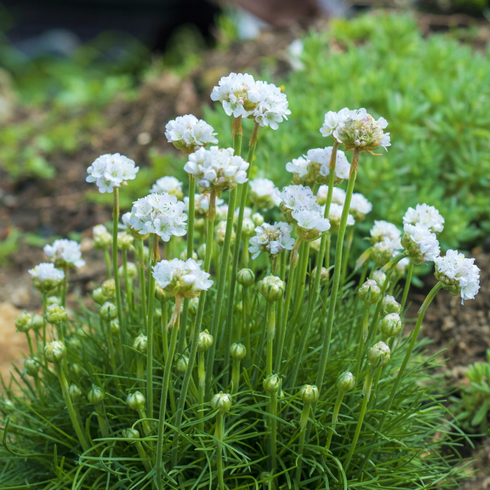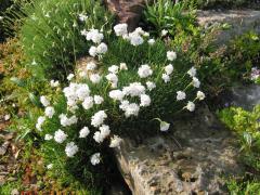 Kompaktný zelený vankúšik s bielymi kvetmi je ozdobou každej skalky.