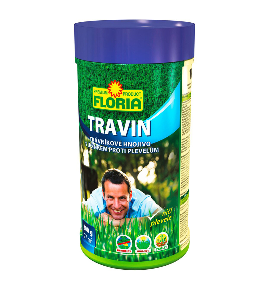 Charakteristika: Trávnikové hnojivo ´TRAVIN´ je kombinovaný granulovaný prípravok určený na výživu a udržiavanie okrasných trávnikov v stave bez neželaných burín. Zloženie: hnojivo - vyživuje, zeolit - aktivuje pôdu, zlepšuje pôdnu štruktúru a vodný režim, optimalizuje pH, herbicídy - obsahuje dva selektívne herbicídy : fluroxypyr a clopyralid. Výhody: pôsobí ako hnojivo, herbicíd a aktivátor pôdy účinkujú dva mesiace, likviduje burinu od klíčenia s výbornými toxikologickými vlastnosťami.