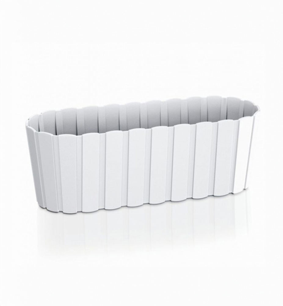 Biely oválny plastový truhlík, ktorý navodzuje dojem, že je vyrobený z malých dosiek.