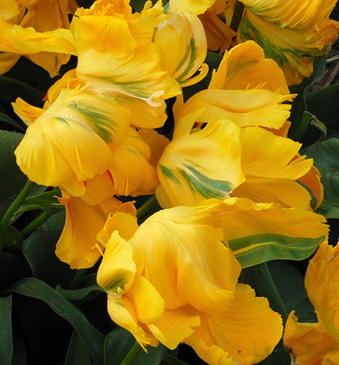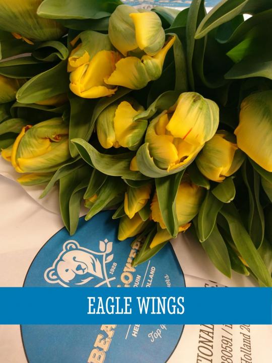 Charakteristika: Tulipán ´Eagle Wings´ patrí medzi kultivary, ktoré sa ľudovo nazývajú papagáje. Okvetné lístky sú zvlnené a majú strapatý okraj. Kvety majú výraznú žltú farbu s nepravidelnou kresbou na niektorých lupeňoch. Tento kultivar vyniká aj netradičnými listami, ktoré sú podobne ako kvety výrazne zvlnené.
