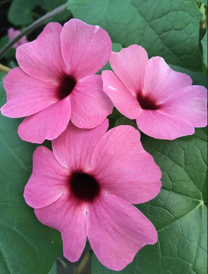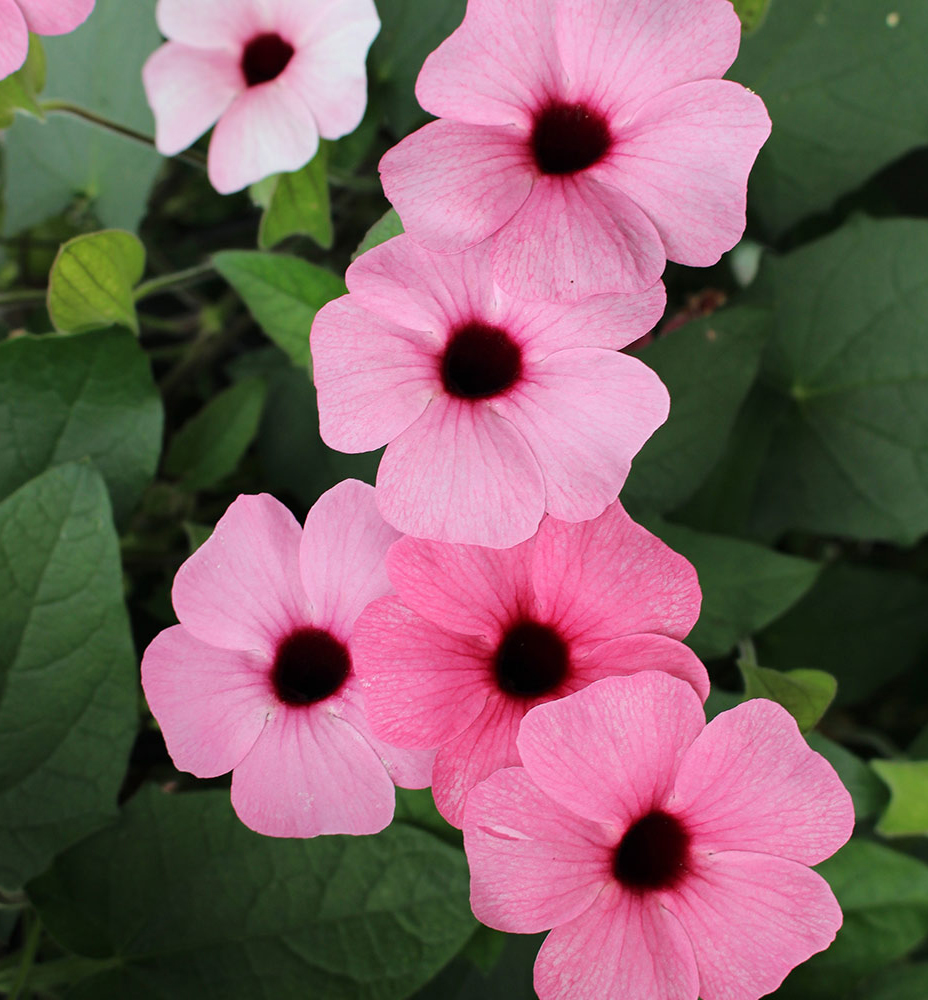 Okúzľujúca tunbergia s atraktívnymi ružovými kvetmi s výrazným červeným očkom.