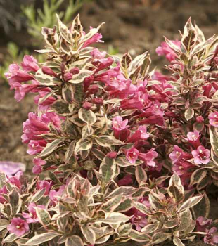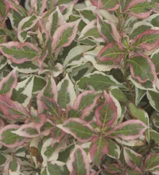 Atraktívna trojfarebná vŕba s tmavými ružovými listami na mladých výhonoch.