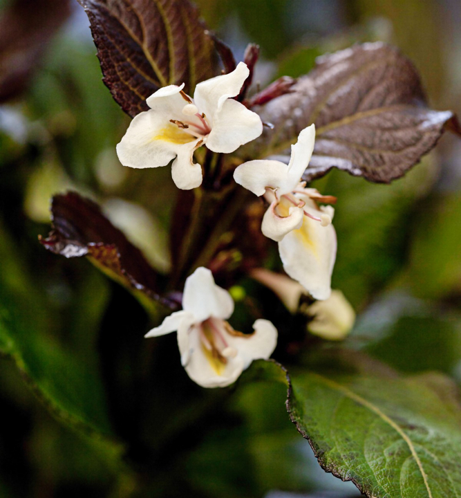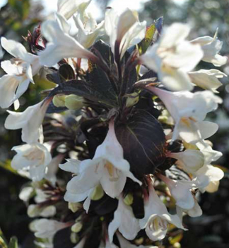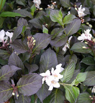 Vždyzelený kompaktný ker s dvojfarebnými listami a bielymi kvetmi.