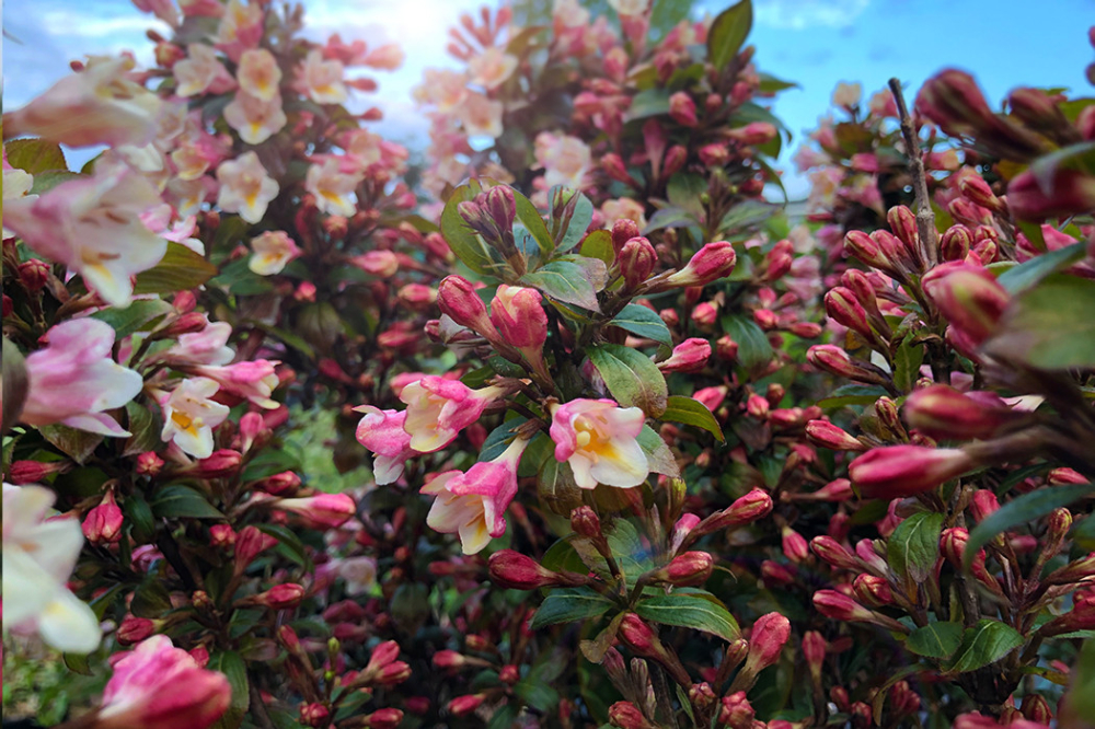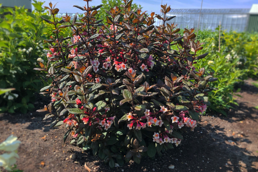 Bohato kvitnúca nízka vajgela s pútavými lososovými kvetmi.