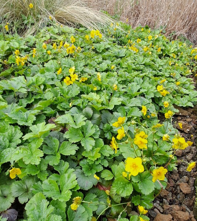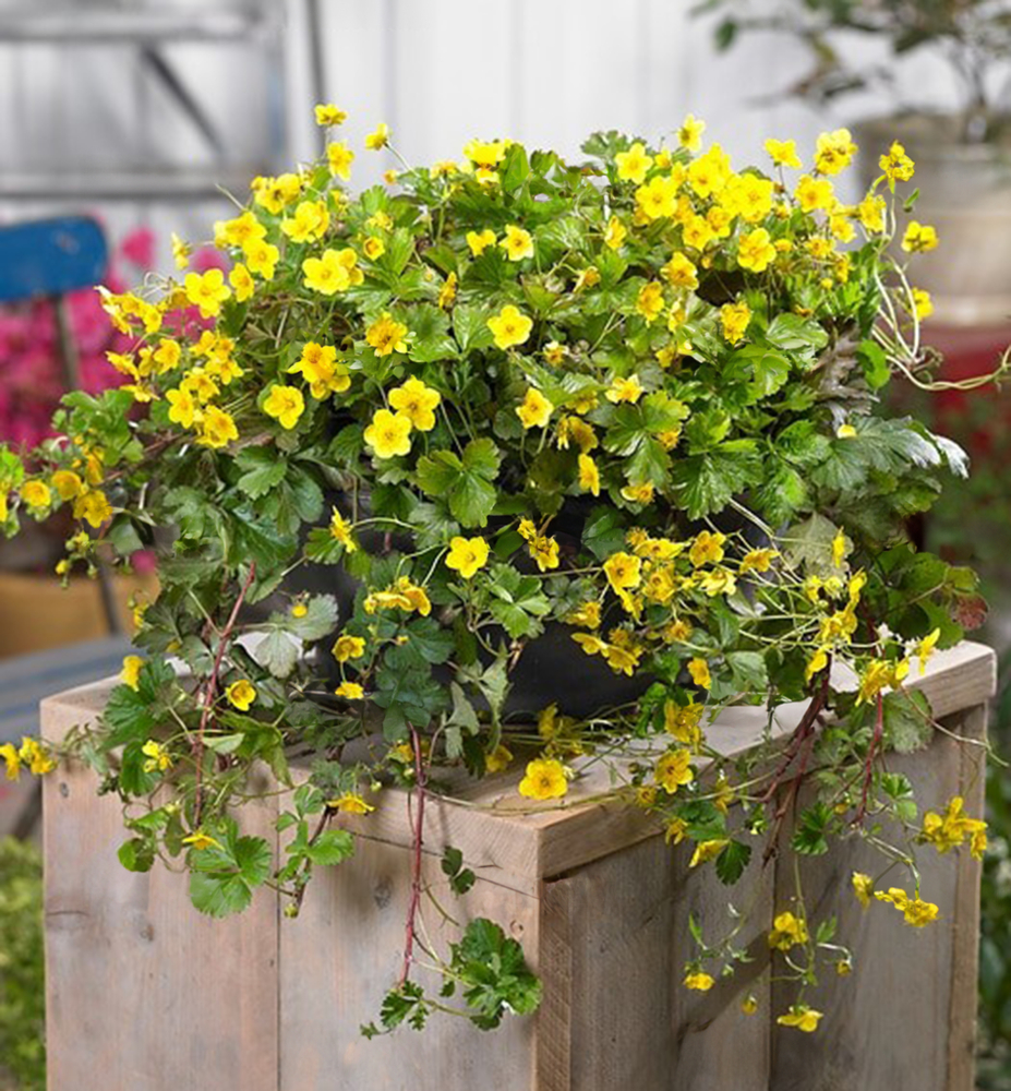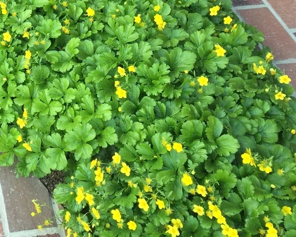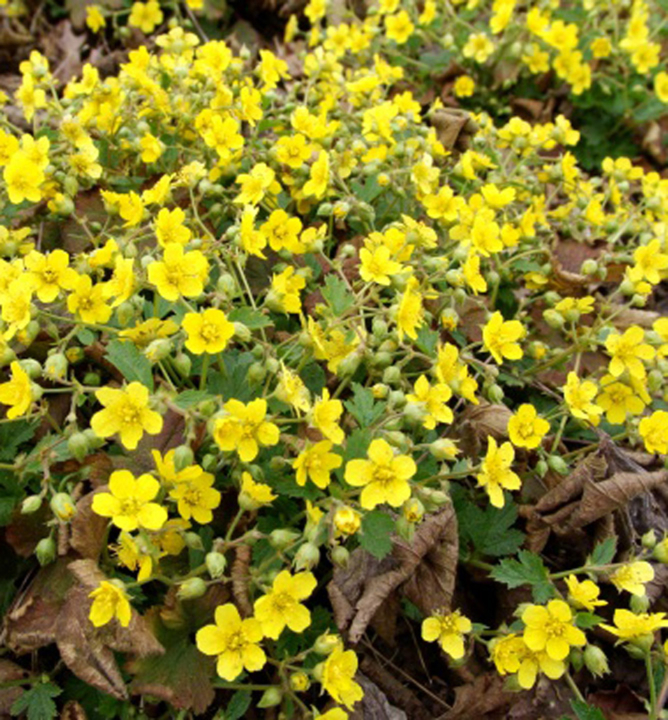 Tieňomilná pôdopokryvná trvalka so žiarivo žltými kvetmi.