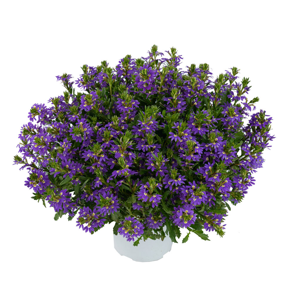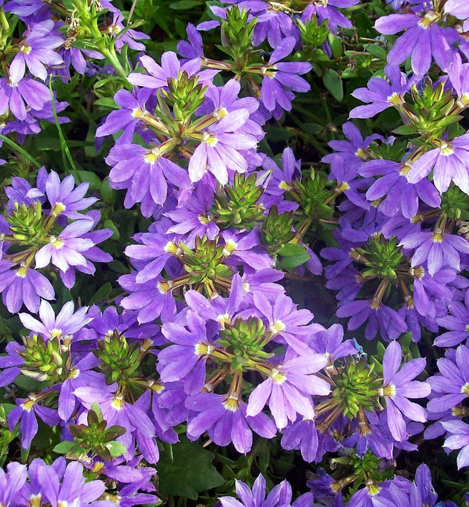 Obľúbená bohato kvitnúca vejárovka s množstvom tmavofialových kvetov.