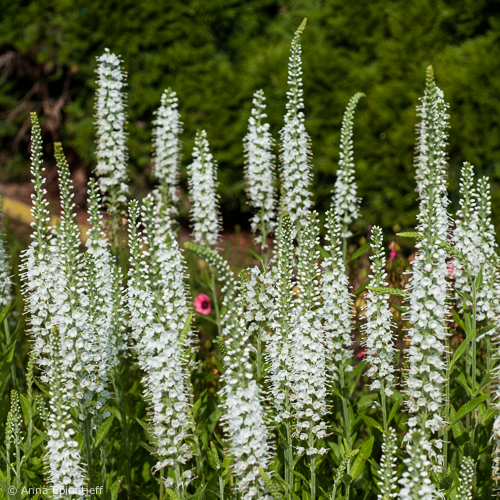 Pestovanie: Veroniku sadíme do suchšej záhradnej pôdy na slnečné alebo polotienisté miesto. Nie je náročná, toleruje prechodné sucho aj vlhko. Vďaka výrazným bielym kvetom sa veľmi dobre kombinuje s ostatnými vyššími trvalkami, napr. kokarda, gaura, rozchodník, levanduľa. Pomerne rýchlo sa rozrastá a tak každoročne vytvára väčší farebný efekt.