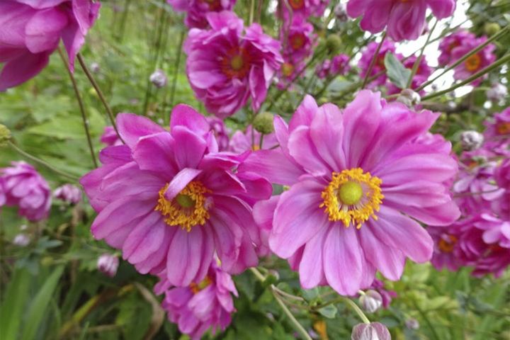 Plnokvetá veternica s kvetmi na dlhých stonkách, skutočný jesenný skvost záhrady.