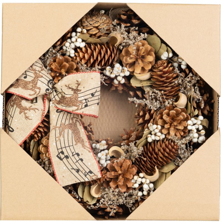 Charakteristika: Tento veniec je vyrobený z prírodných materiálov, ako sú šišky a sušené dekorácie, ktoré pôsobia autenticky a prinášajú do interiéru kúsok prírody. Dekor je doplnený ozdobnou mašľou s hudobným motívom, ktorá dodáva vencu originálny a tradičný vzhľad. Veniec má praktické pútko na zavesenie, takže ho jednoducho umiestnite na dvere, stenu alebo okno. S priemerom 30 cm je ideálnou dekoráciou pre každý domov počas adventného a vianočného obdobia.