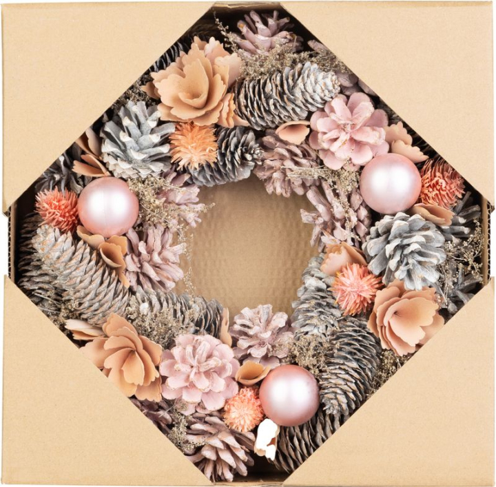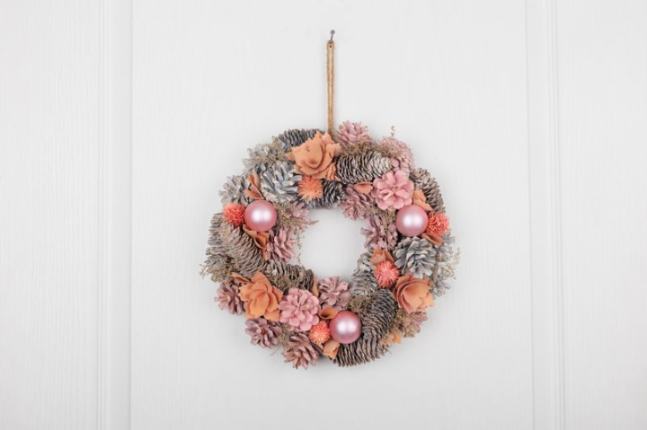 Elegantný vianočný veniec v ružovo-oranžovej farebnej kombinácii.