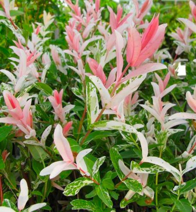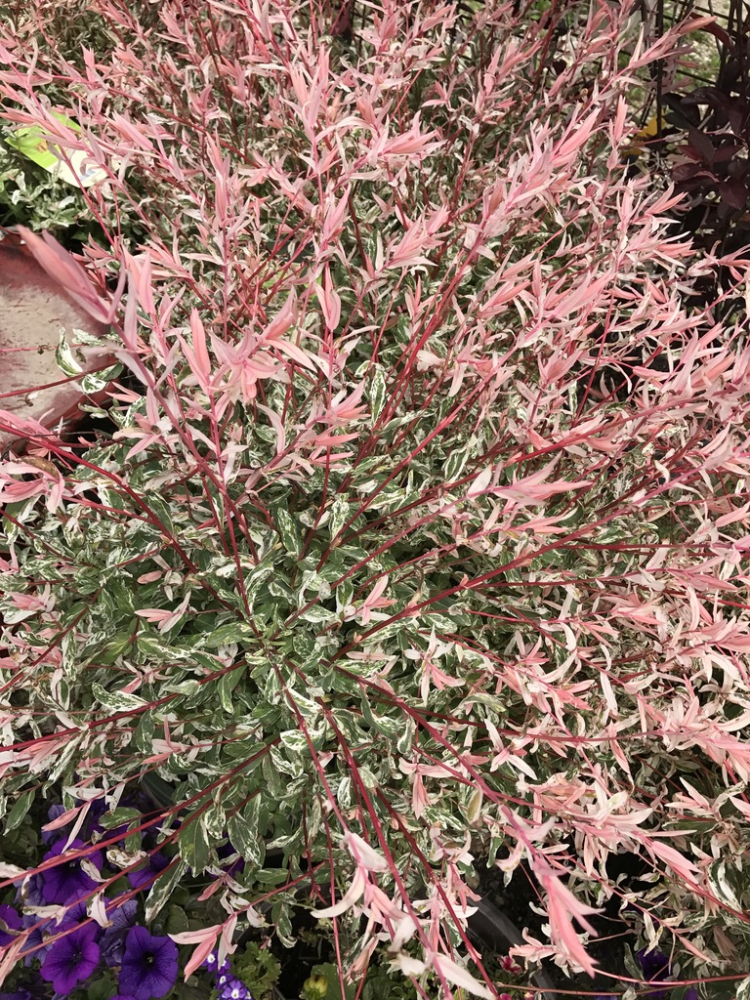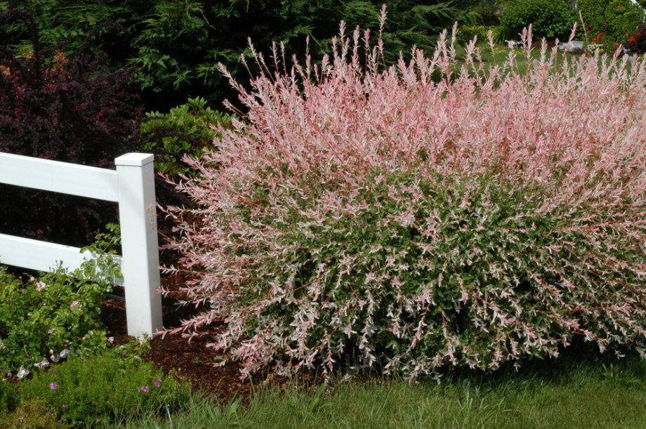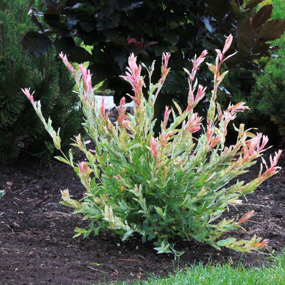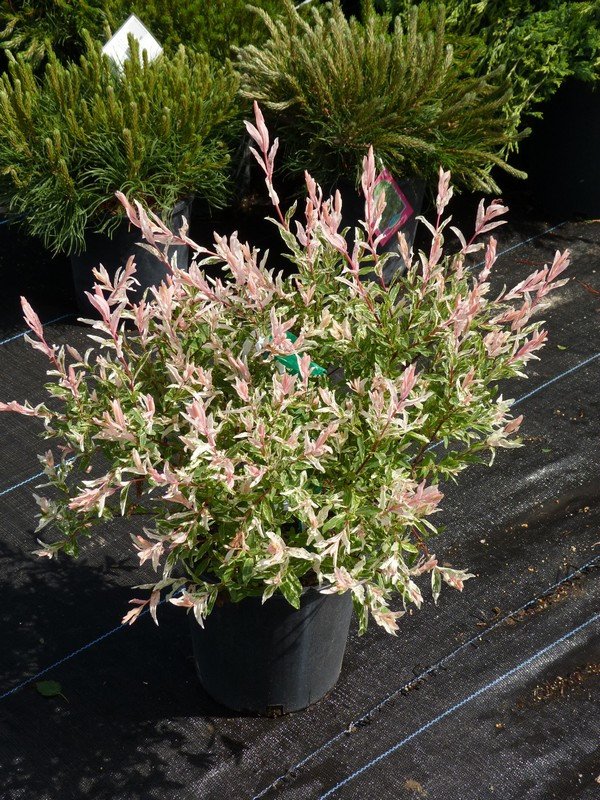 Atraktívna trojfarebná vŕba s tmavými ružovými listami na mladých výhonoch.