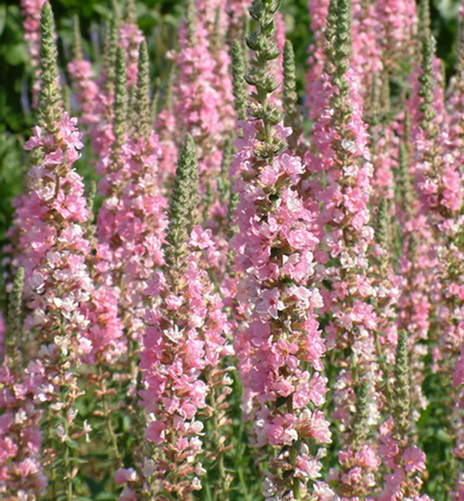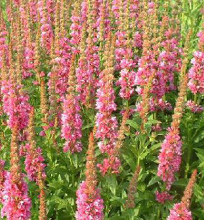 Nádherná bahenná rastlina so sýtomodrými klasmi kvetov a lesklými zelenými listami.