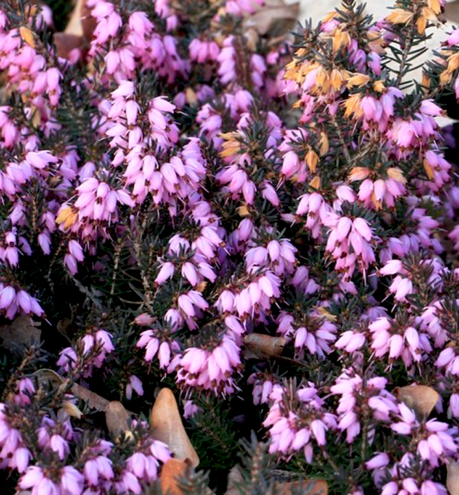 Stálezelený kompaktný ker kvitnúci počas zimy množstvom ružovofialových kvetov.