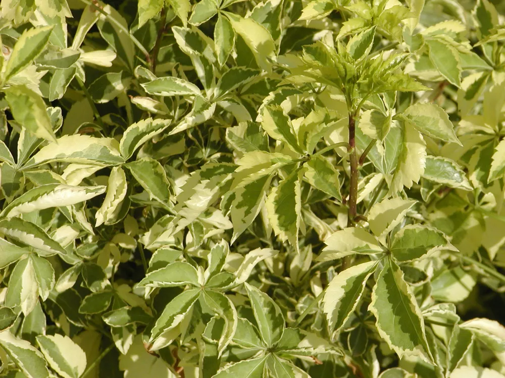 Moderný vždyzelený japonský bršlen s tmavozelenými listami a krémovobielym okrajom.