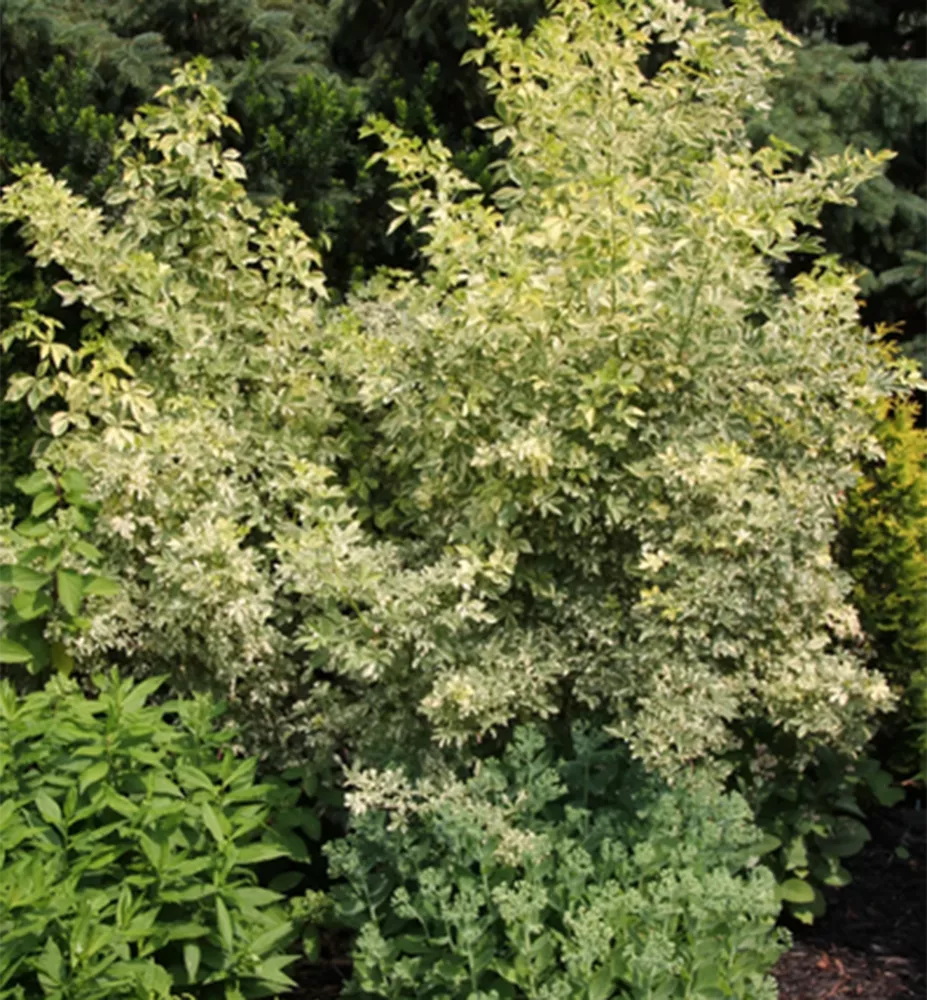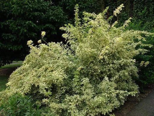 Atraktívny drieň s červenými výhonmi a dvojfarebnými panašovanými listami.
