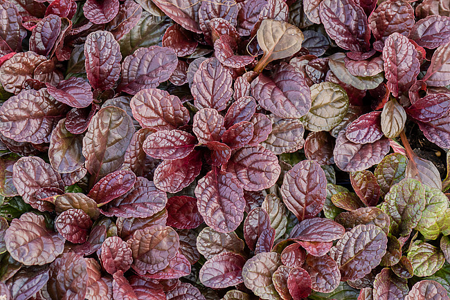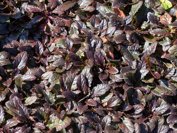 Pôdopokryvná trvalka s výrazne lesklými listami červenohnedej farby.